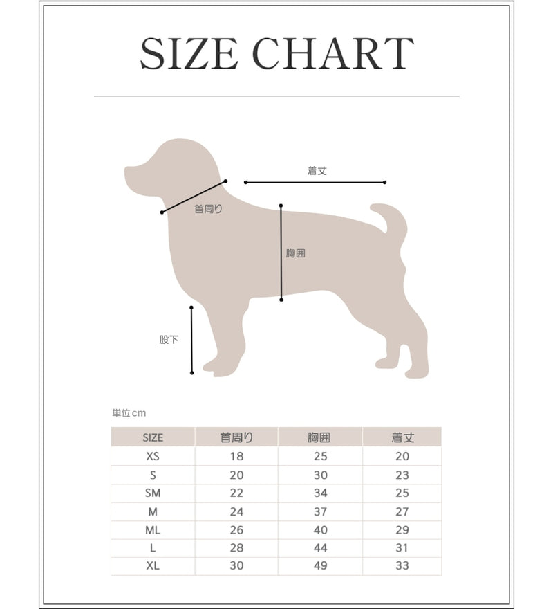 ジャストフィットになるようサイズ表とわんちゃんのヌードサイズを比較して