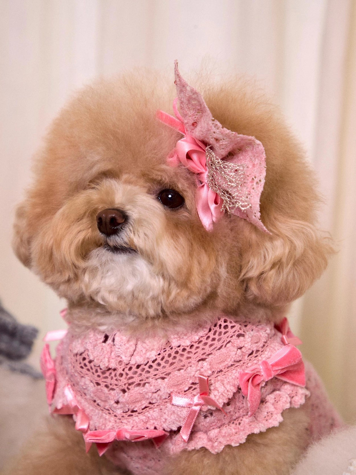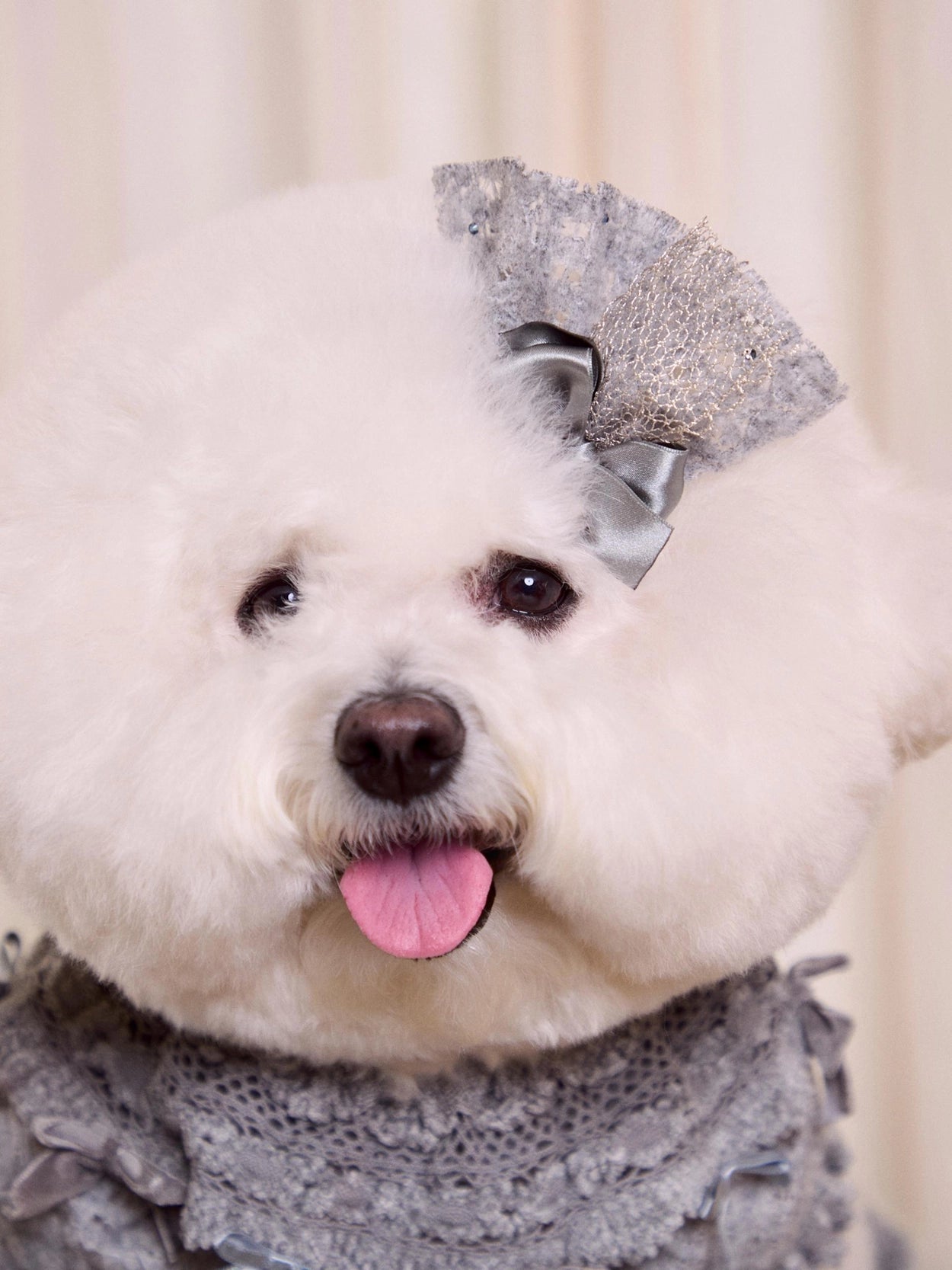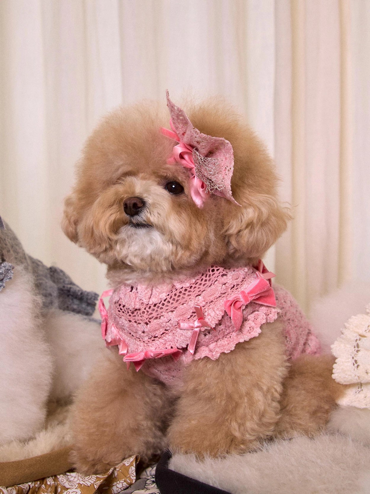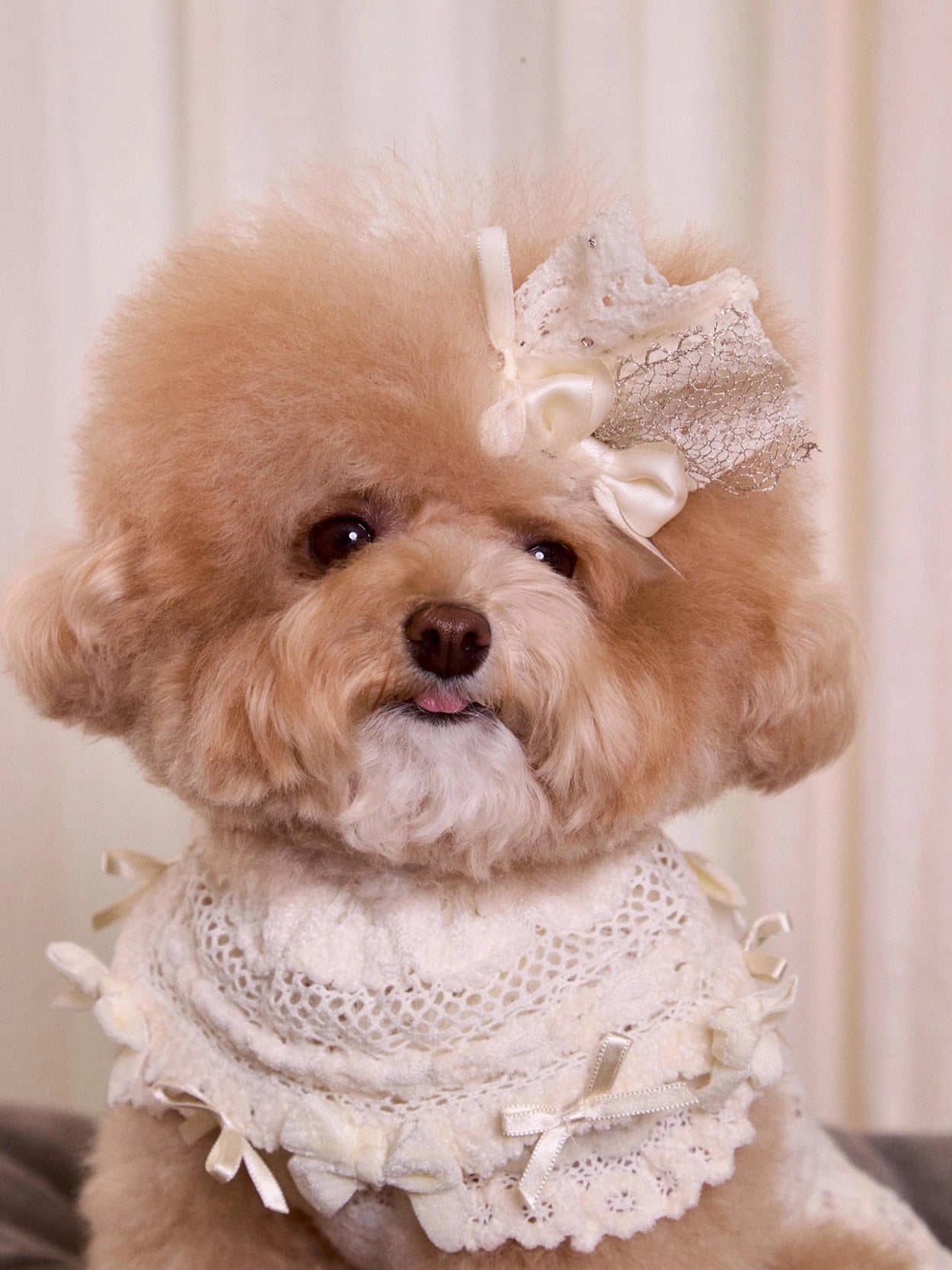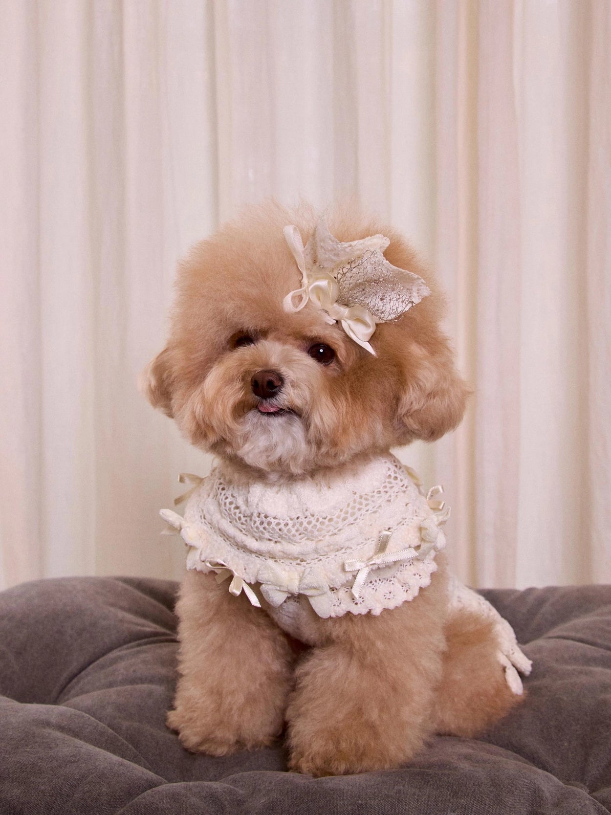 さらに、レースケープの縁にはベルベットとサテンのリボンをあしらい、