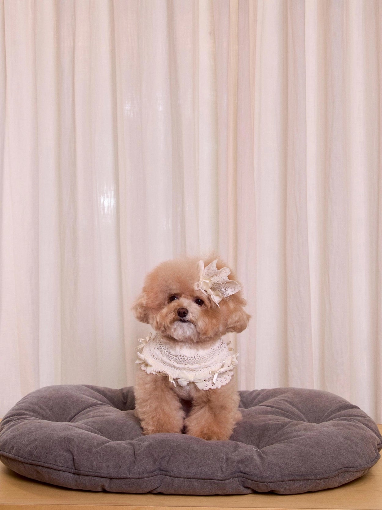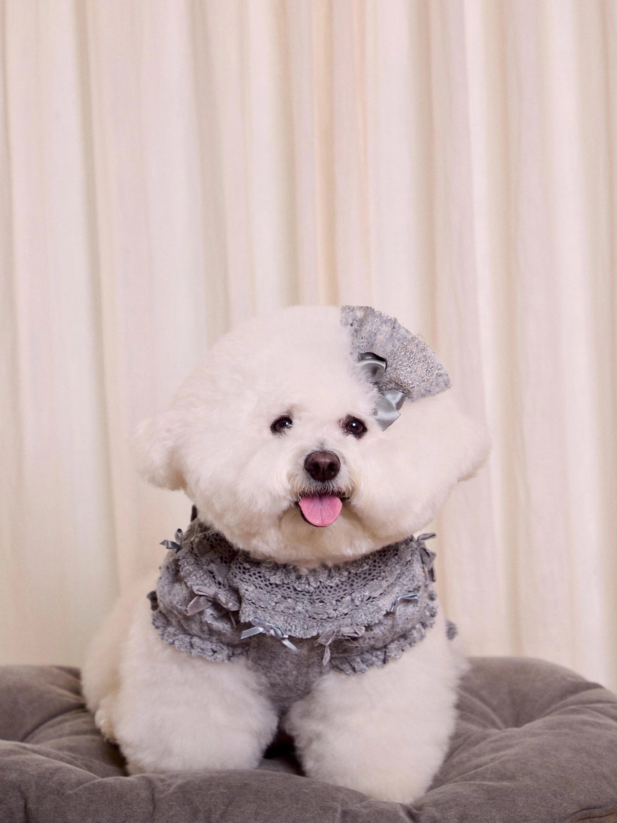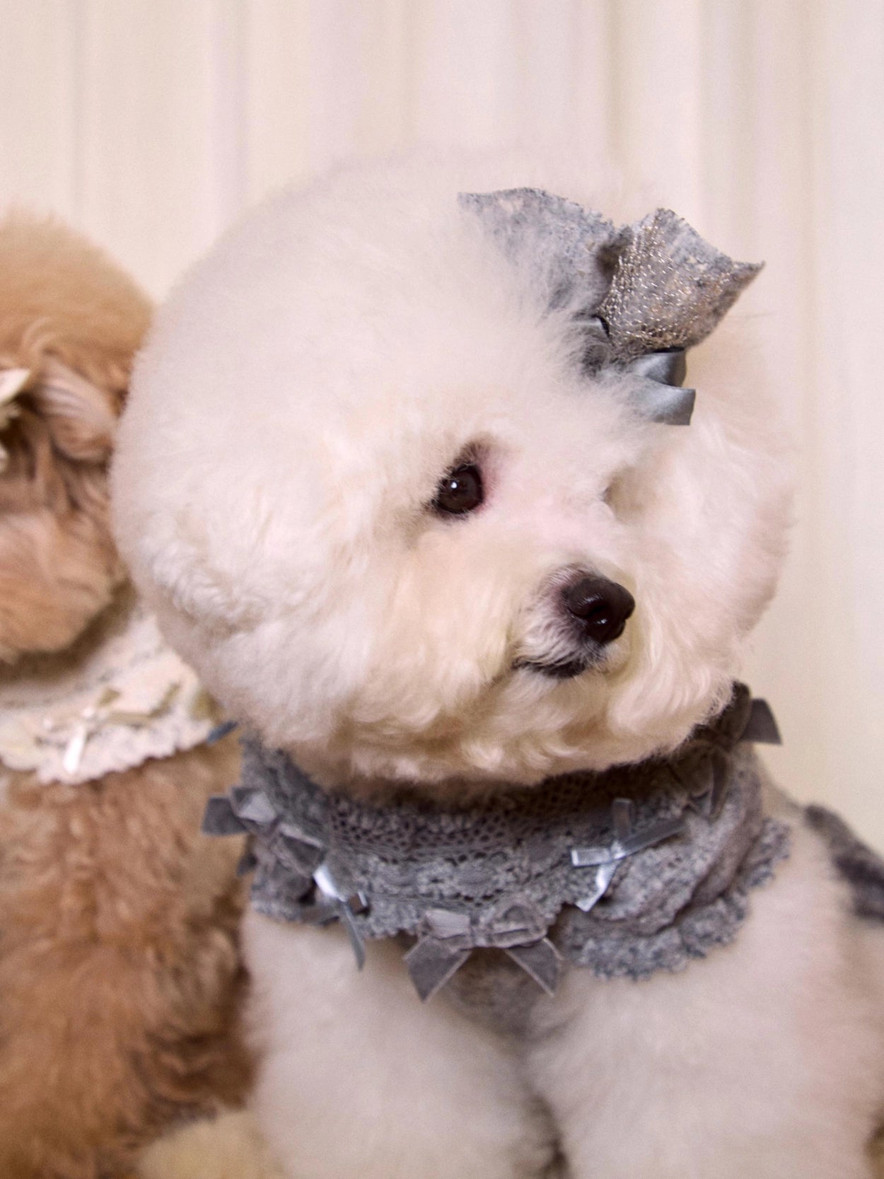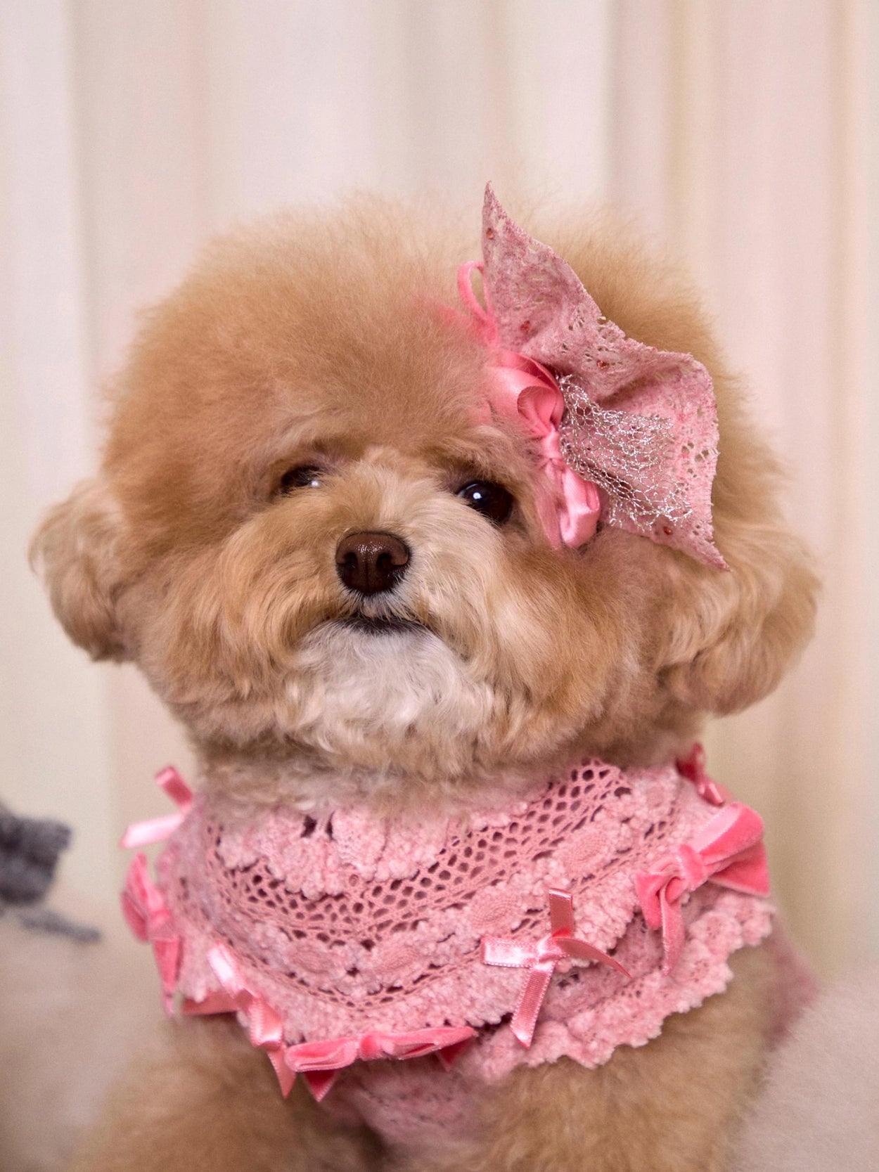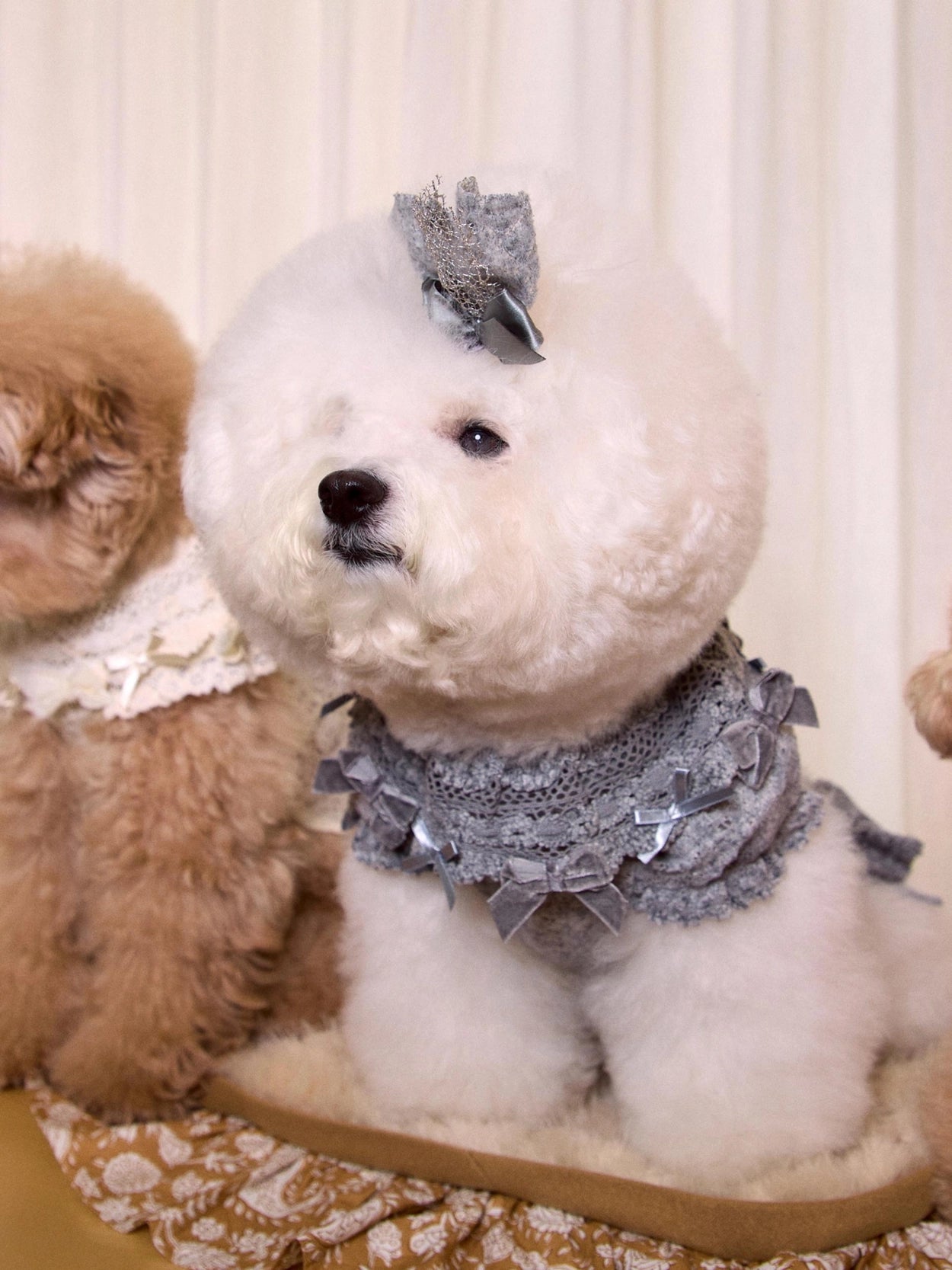 さらに、レースケープの縁にはベルベットとサテンのリボンをあしらい、