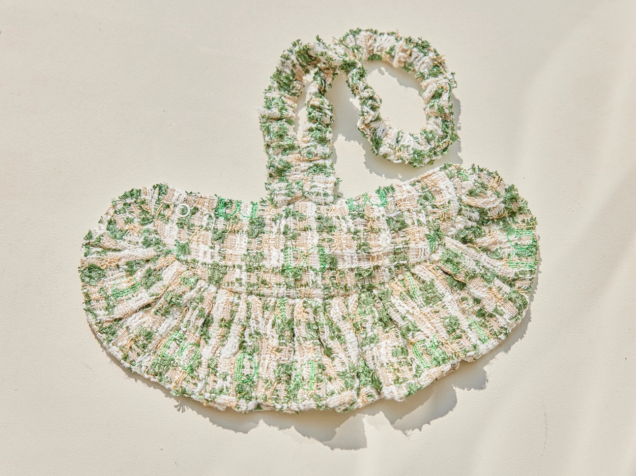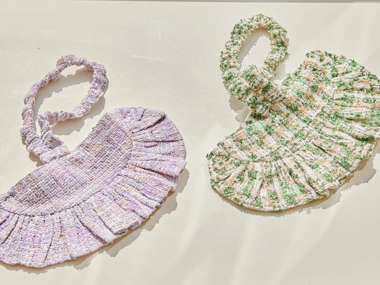 華やかなツイード生地にカラーライニングを入れてブランドロゴ刺繍で仕上げました