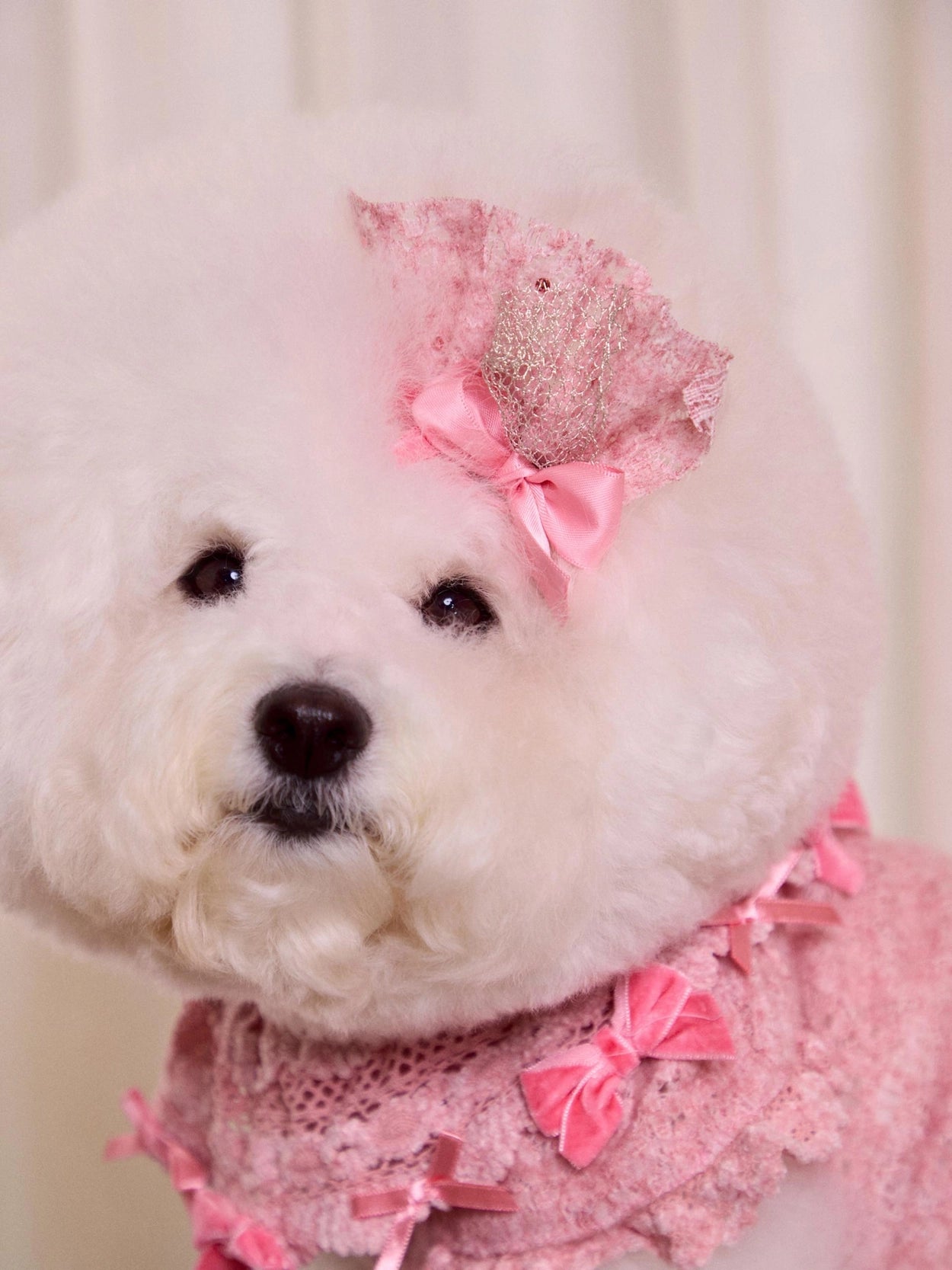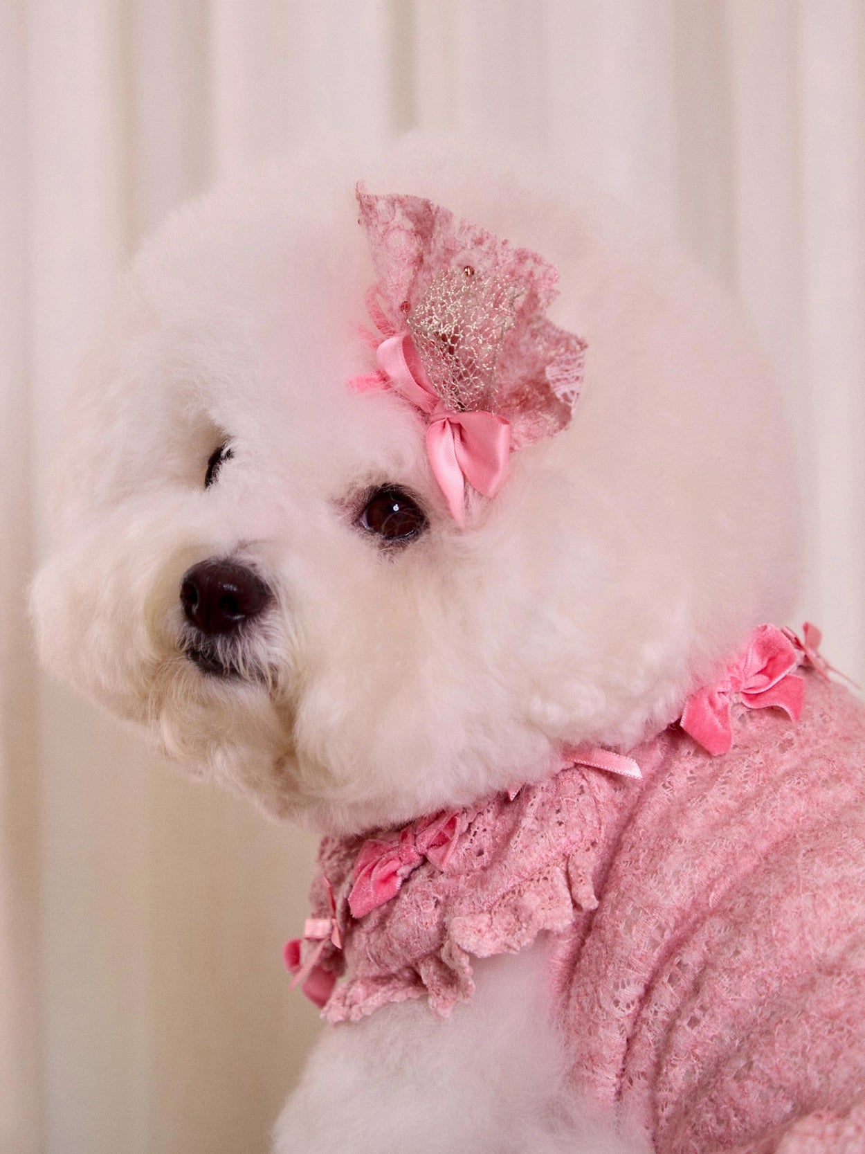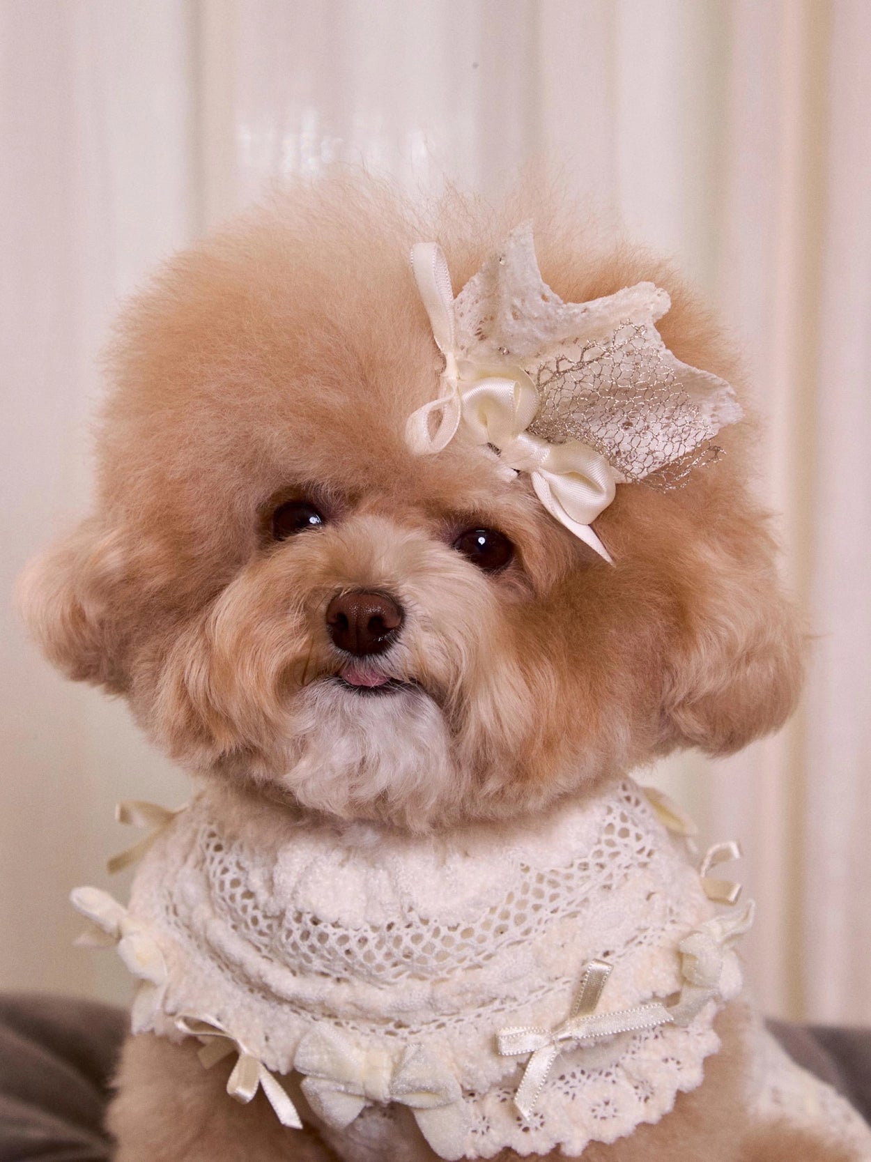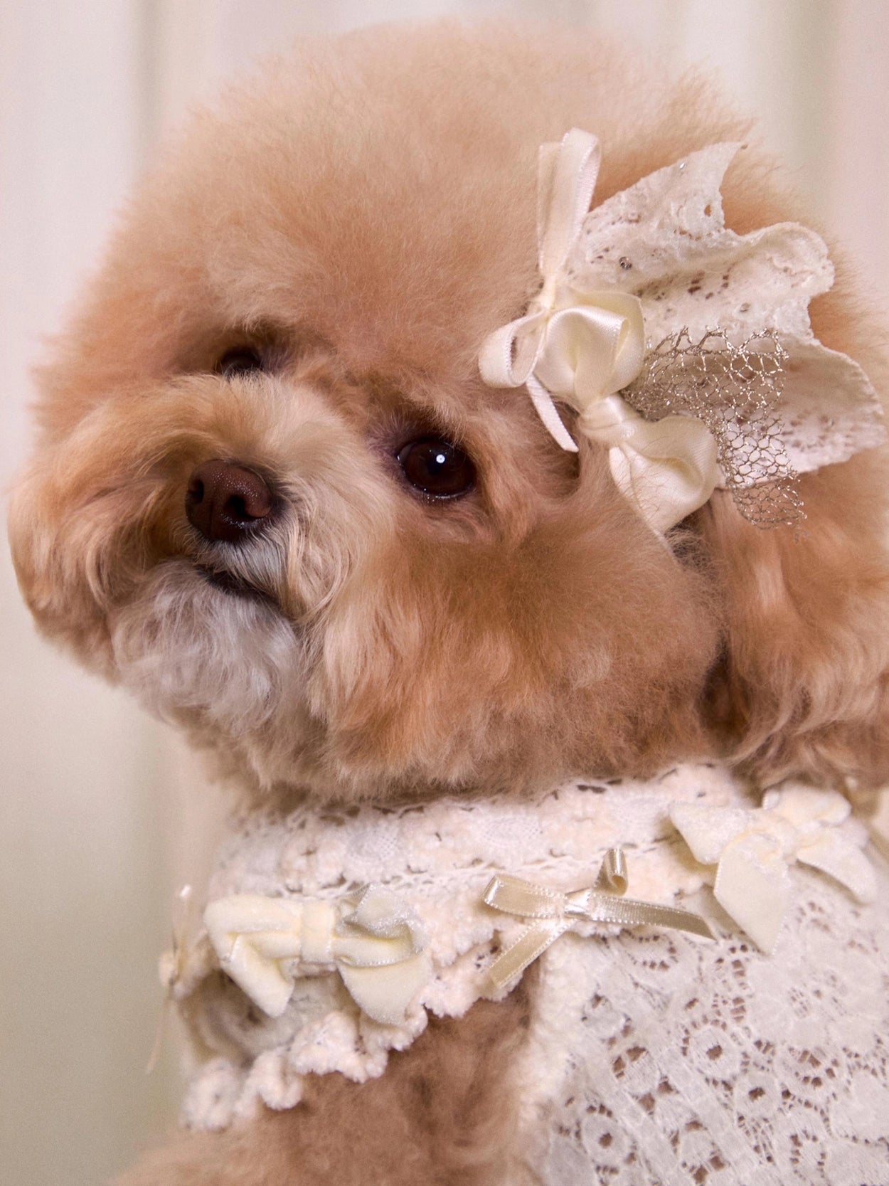 ドレスの豊かなレースボリュームを損なわないよう、
