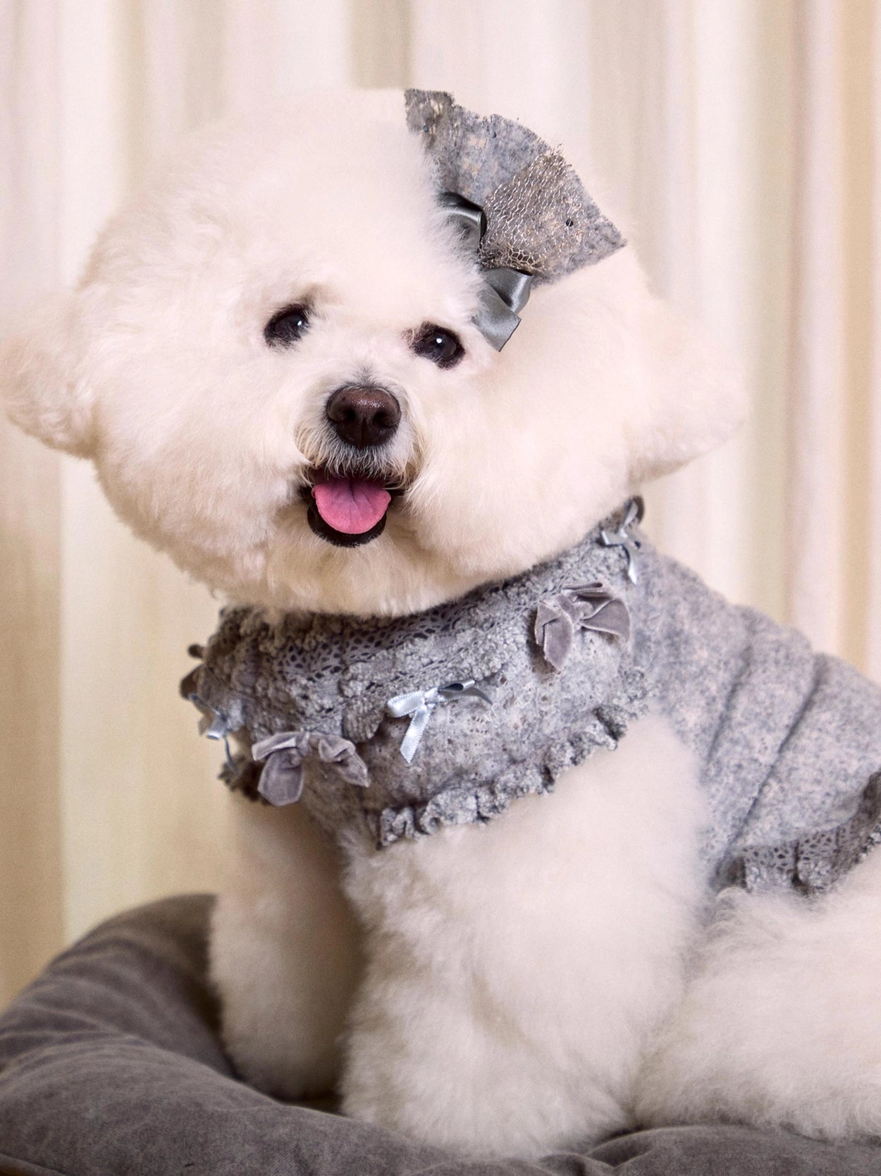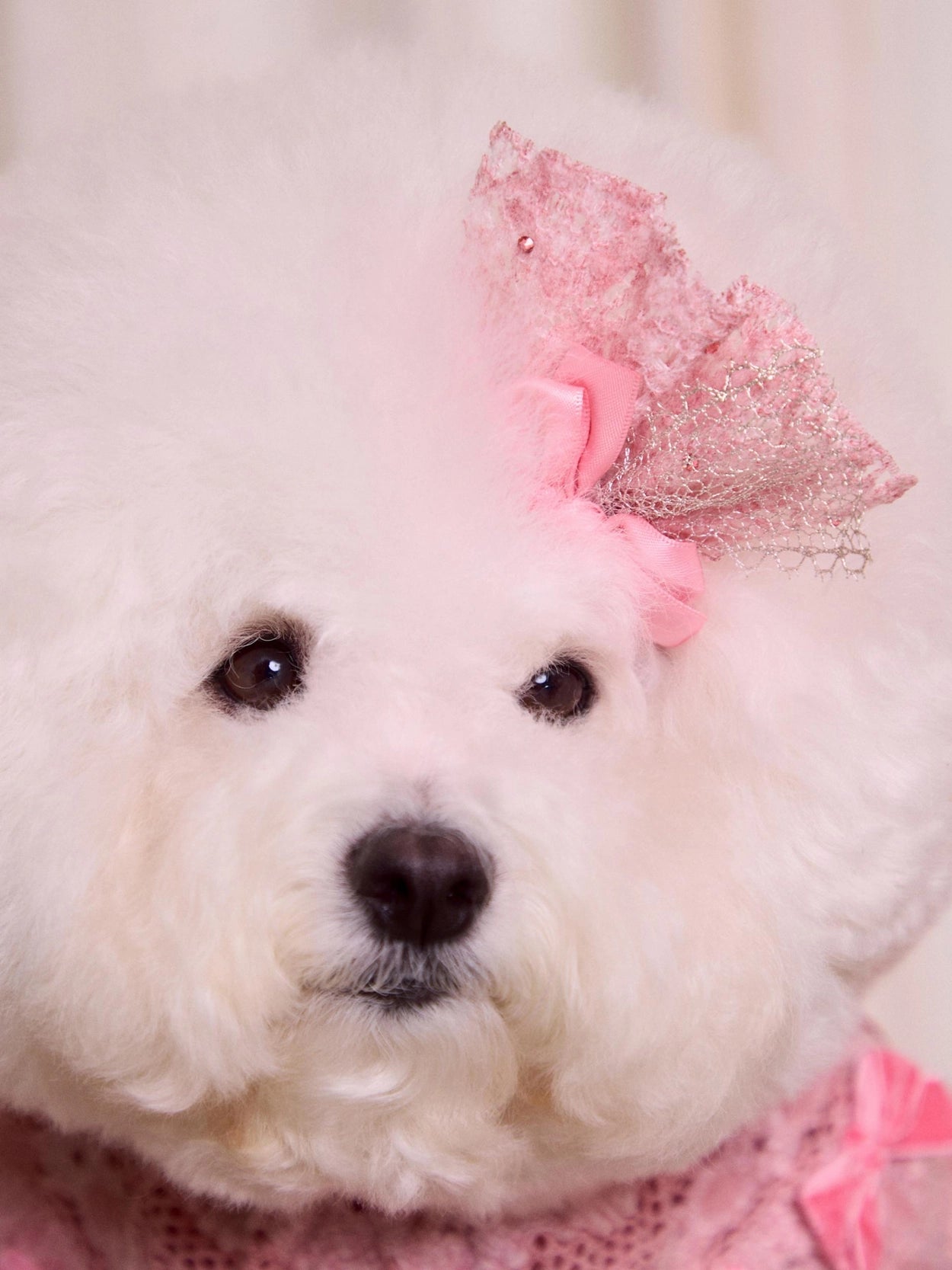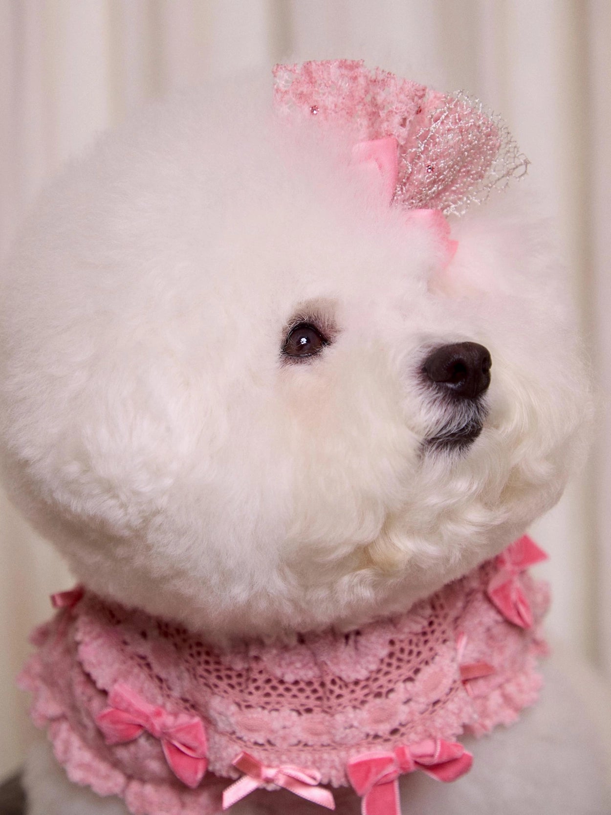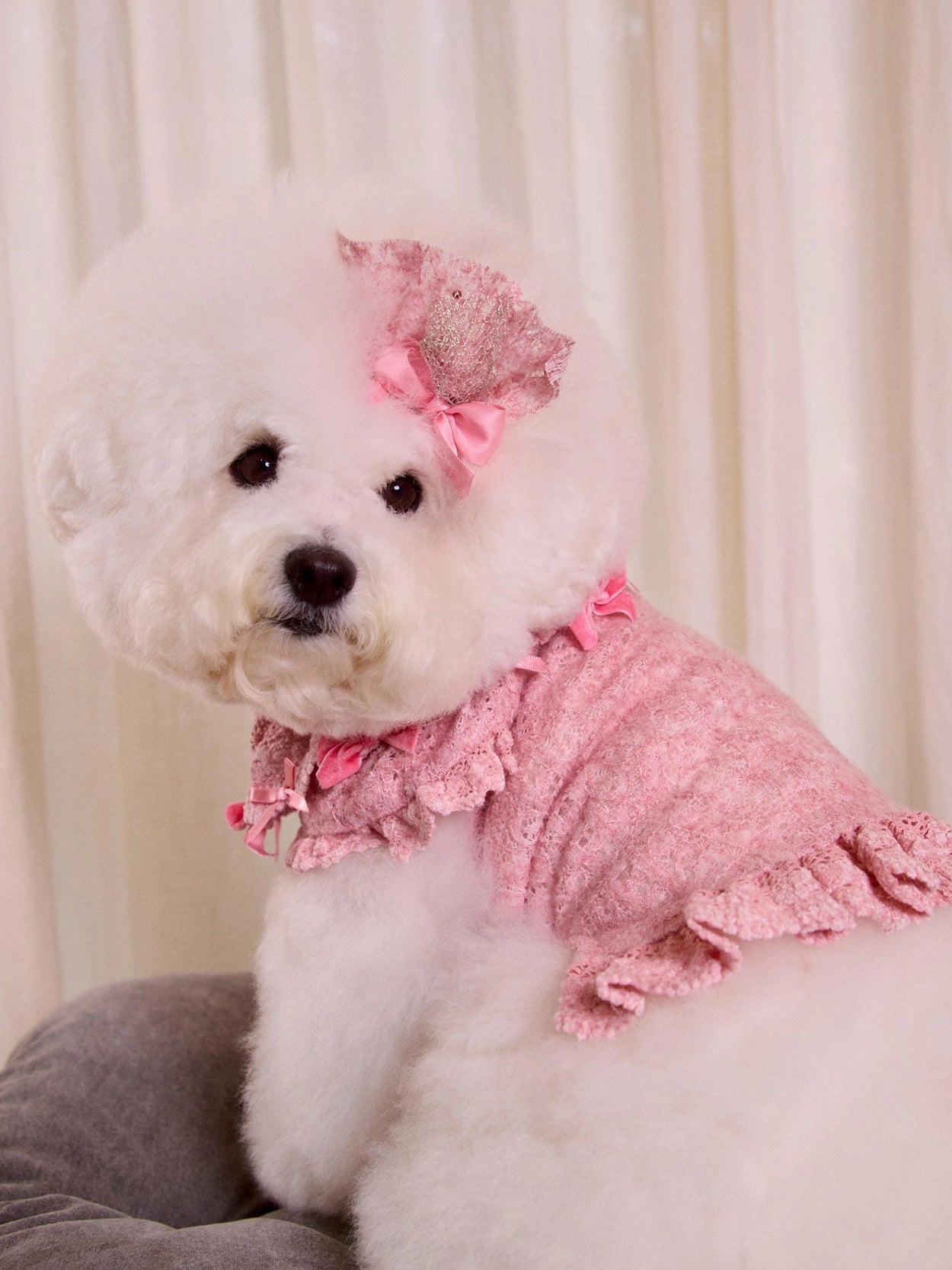 ドレスの豊かなレースボリュームを損なわないよう、