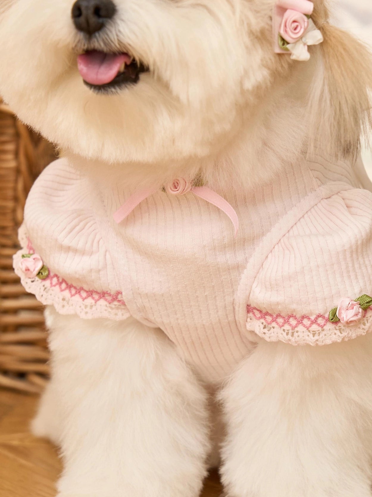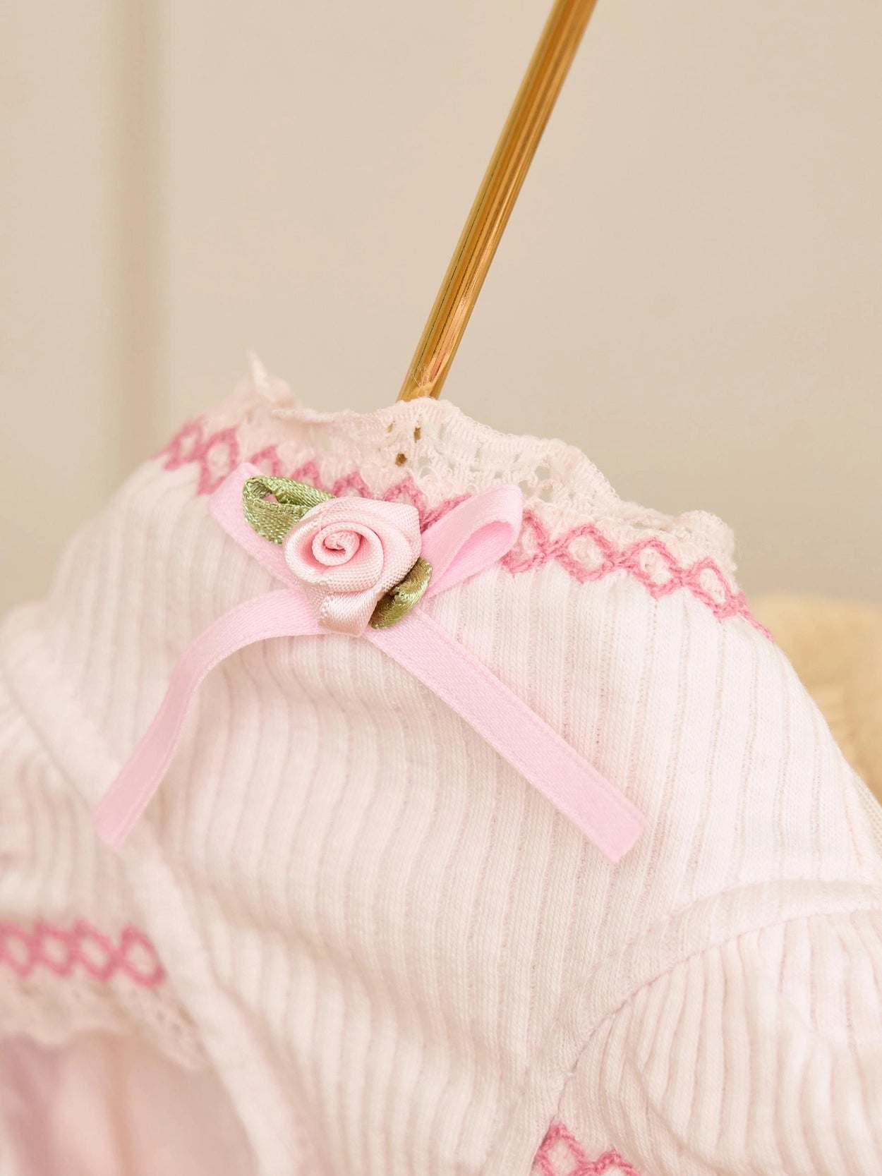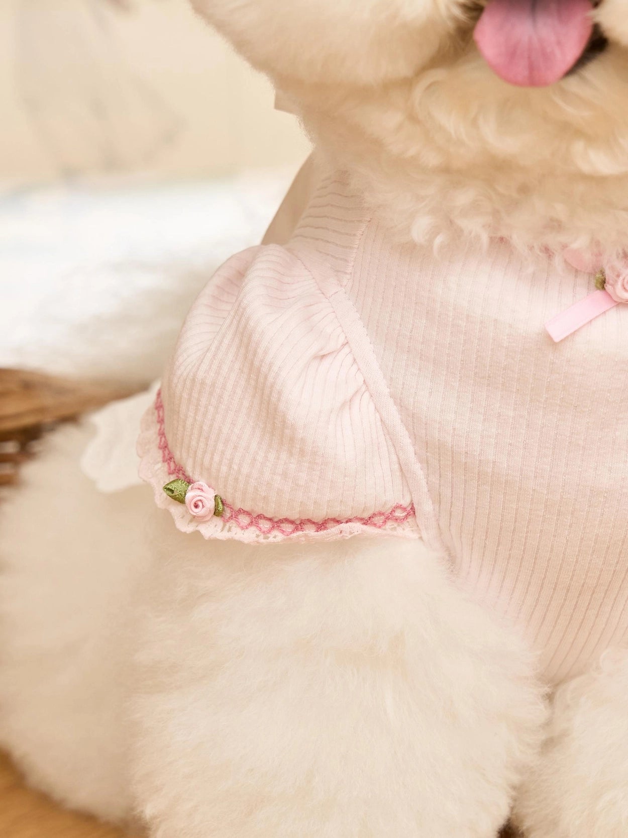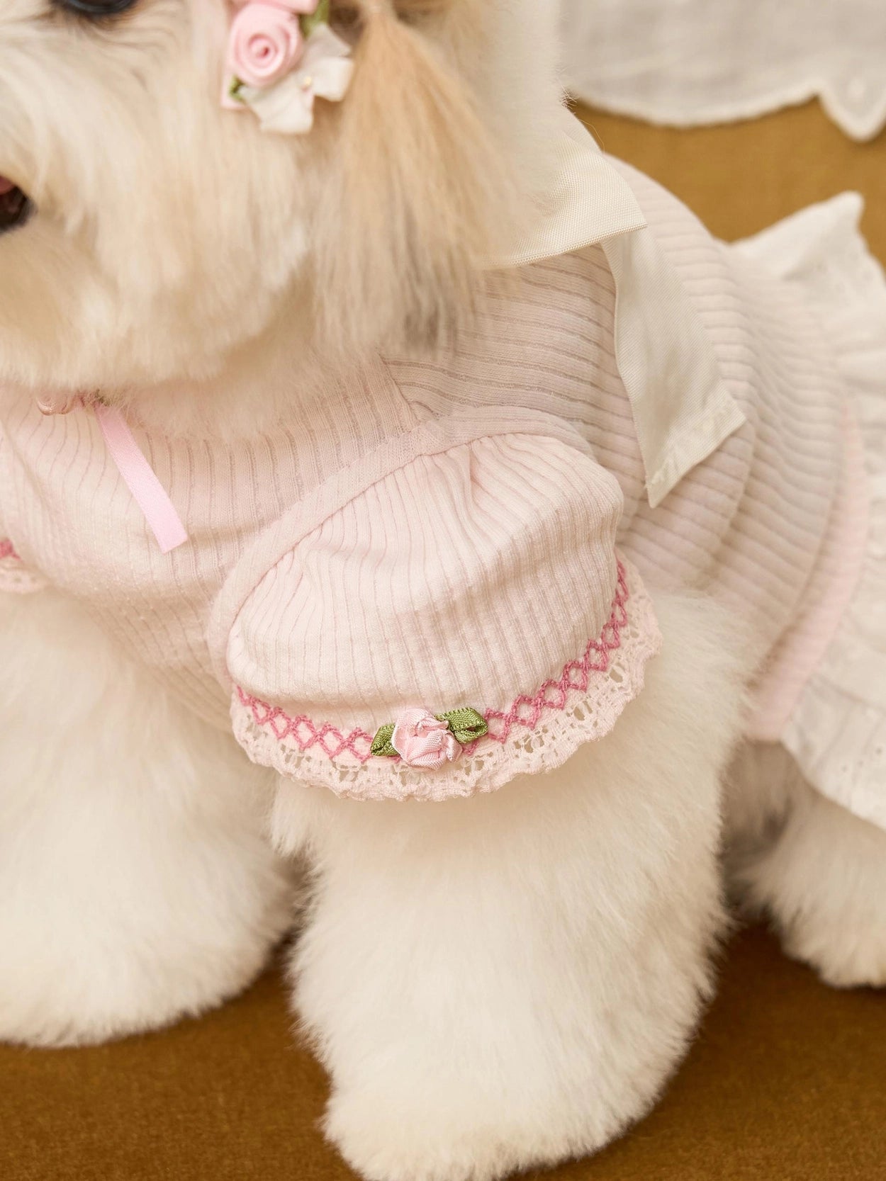 首元と袖には小さなバラの花の刺繍を施し、