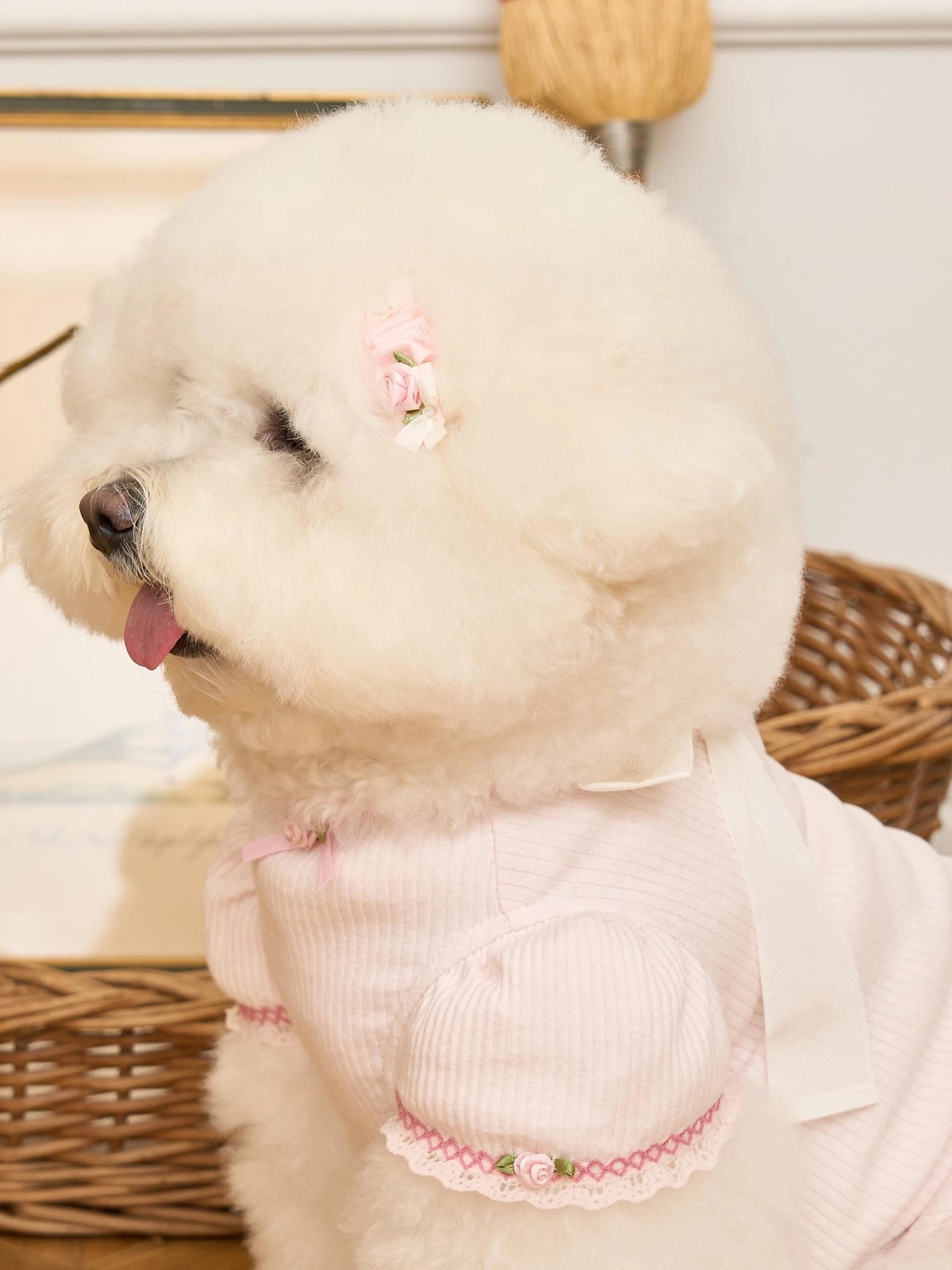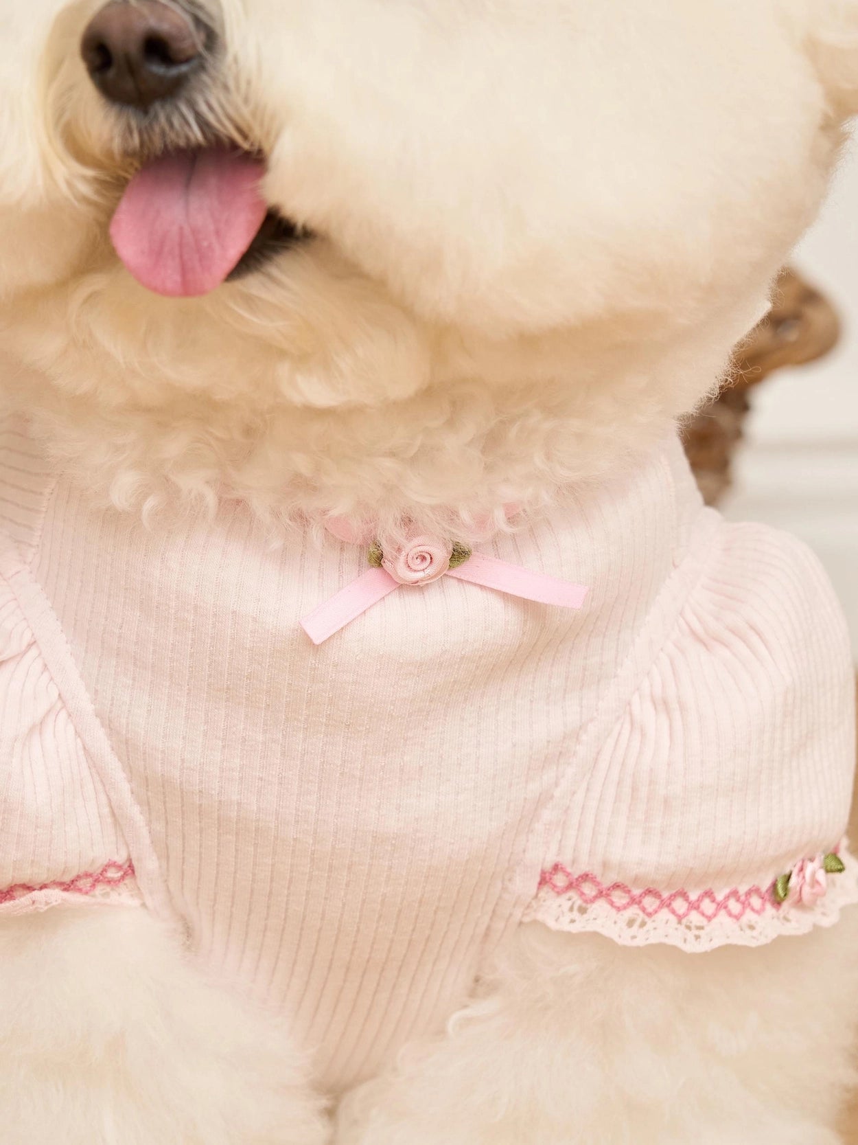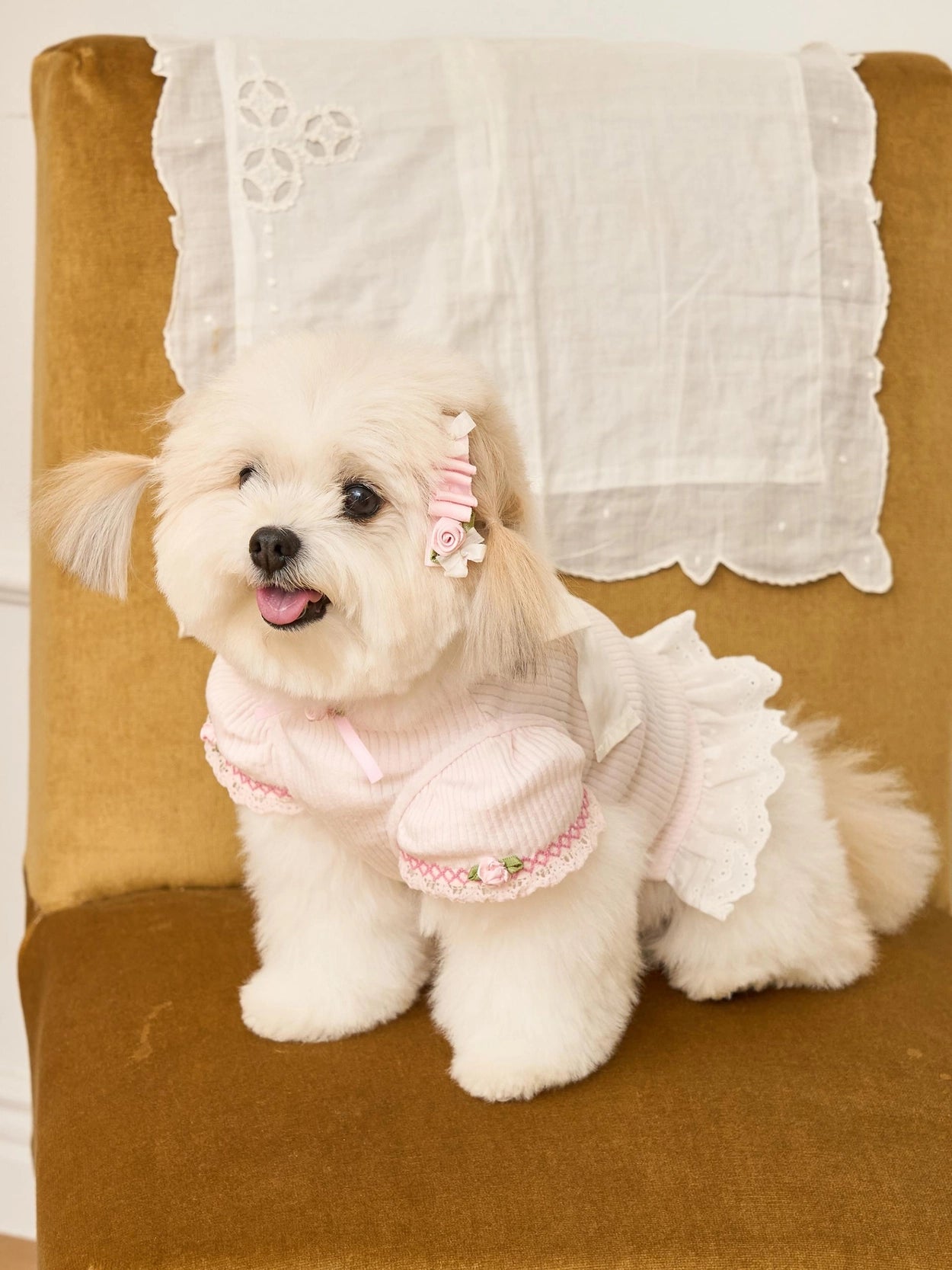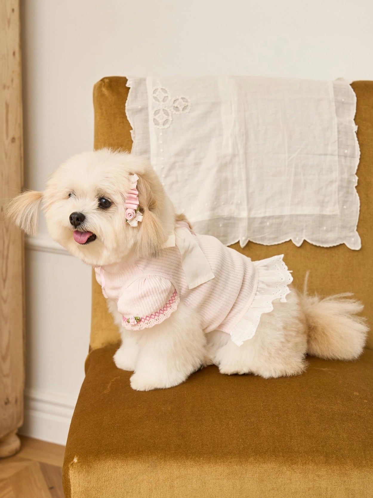 首元と袖には小さなバラの花の刺繍を施し、