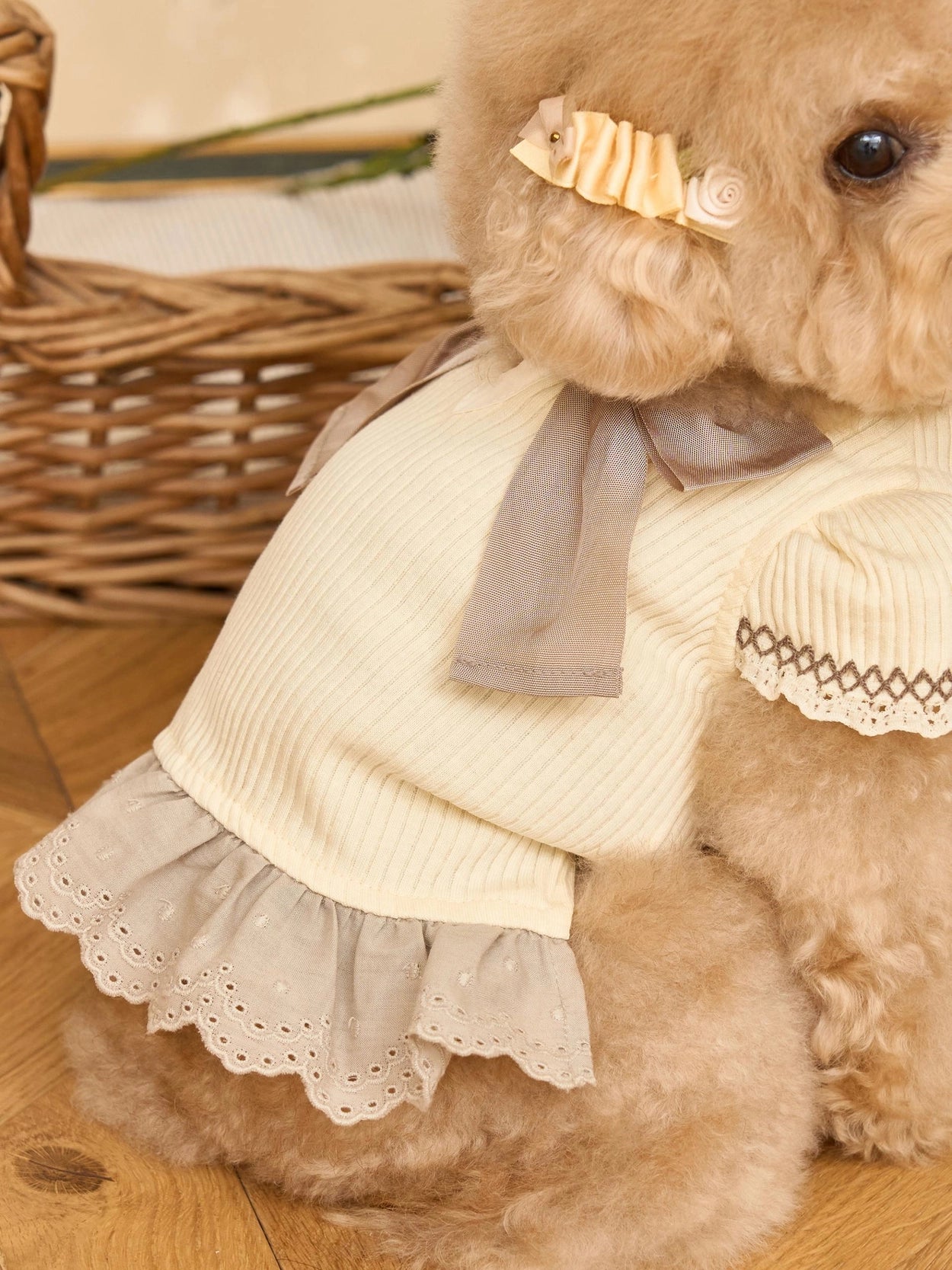 かわいいレースのパフスリーブと背中の大きめのレーヨンリボンがポイントです